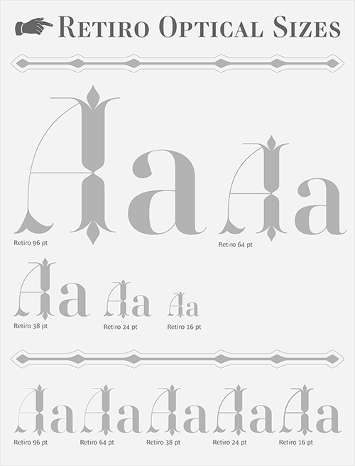 Una atrevida interpretación de la tipografía española. Severa, austera y aún así llena de vida. Retiro es una versión del castellano y el andaluz en forma Didot.